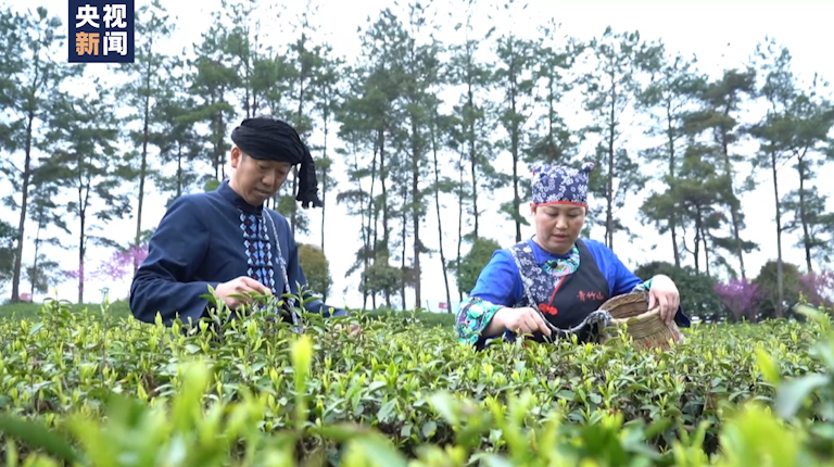 湖南湘西古丈县境内山峦起伏,小河、溪沟众多,自然净化条件优越,常年云雾缭绕,土壤有机质丰富,是适宜茶树生长且拥有悠久种茶历史的区域。随着气温的不断回升,大地吐绿,茶叶逐渐吐露出嫩芽。在湘西土家族苗族自治州古丈县默戎镇盘草村的3000余亩的茶园里,鲜绿的茶树迎风摇曳,嫩绿的新芽迎风而立,茶农们穿梭在茶树间,一边唱歌一边不停地采摘茶叶。